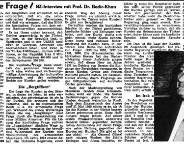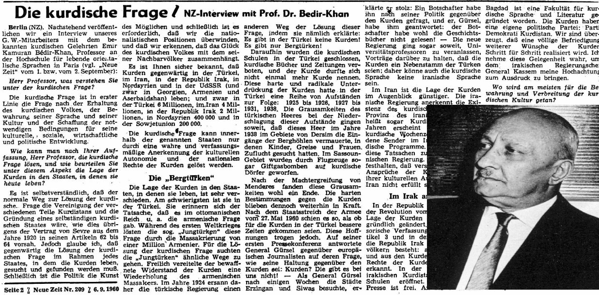 Hristiyan-demokrat çizgide yayın yapan ve Batı Almanya’yı himayesine alan ABD, İngiltere ve Fransa’nın desteklediği bu gazetenin; Kürt sorununun nasıl çözülmesi gerektiği konusunda Prof. Bedirxan’ın fikirlerine başvurusu önemlidir. Prof. Dr. Kamiran Bedirxan’ın üzerinden 64 yıl geçmesine rağmen fikir ile analizlerinin hâlâ güncelliğini koruması açısından bu röportajı Türkçeye çevirerek olduğu gibi yayımlıyoruz: